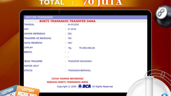 Bukti transfer yang dapat anda lihat adalah bukti SAH / VALID yang langsung di dapatkan melalui bukti transaksi dari Bank yang digunakan untuk pengiriman dana pada rekening pemilik user id. Terima kasih kami sampaikan kepada para pengguna setia DEWALIVE yang telah menggunakan situs kami, sebagai Bandar Terpercaya yang pastinya membayar semua kemenangan member hingga lunas. Apakah DEWALIVE PENIPU ? Reputasi “DEWALIVE TERPERCAYA” sudah sangat melekat.